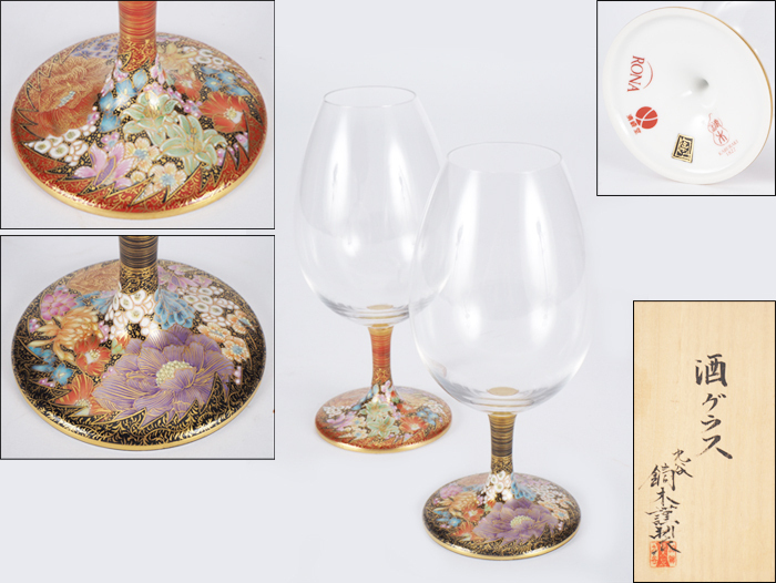 - 九谷 鏑木 謹製 中村陶志人 作 酒 ( ワイン ) グラス一対 共箱 高さ16.9㎝ XM79