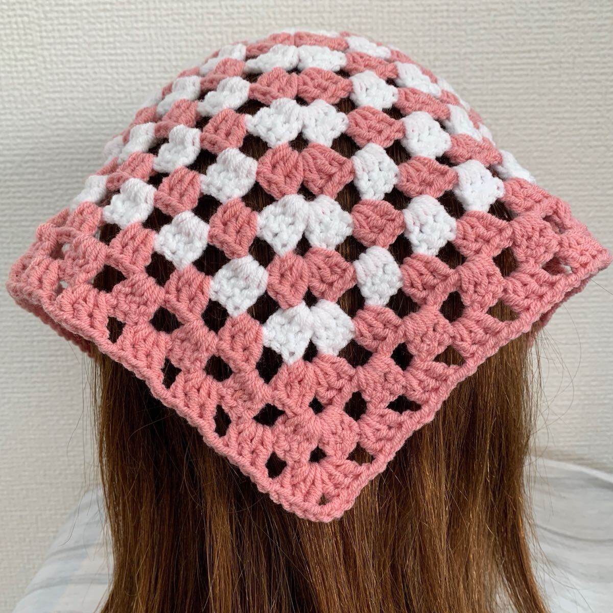 - 【a58】チェッカー 春 桜の花びら ホワイト×ピンク バブーシュカ ボンネット