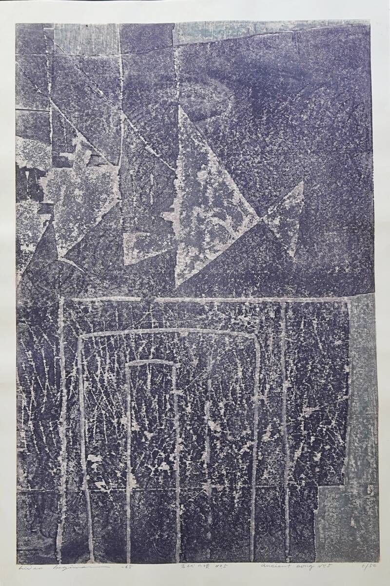 > 【真作・額装】萩原英雄 サンパウロ・ビエンナーレ出展作 大判木版画『古代の唄 No.5 (ancient song) 』限定50部 1965年 直筆サイン入