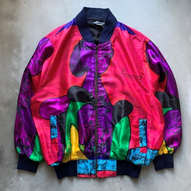 - 【L/XL】80s Picasso ジップアップ ジャケット 総柄■ビンテージ オールド アメリカ古着 アート キュビズム シルクブルゾン