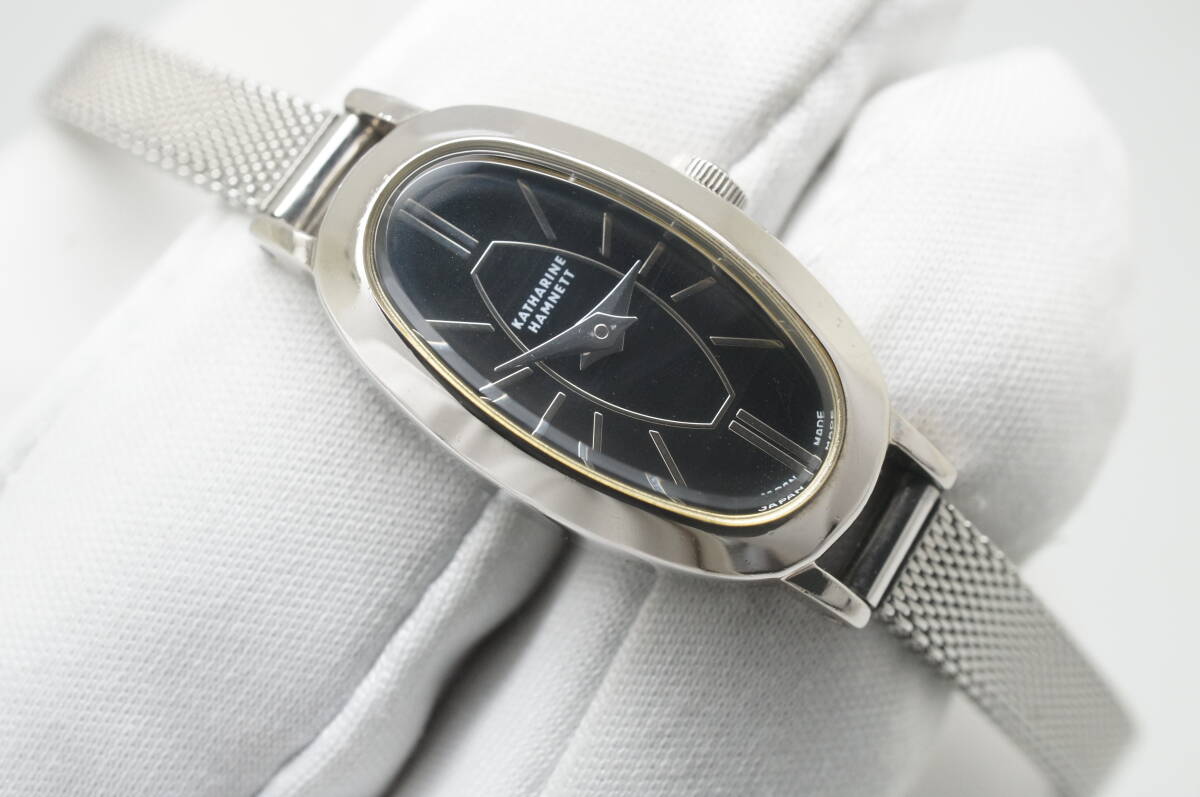 > B86●作動良好 美品 KATHARINE HAMNETT キャサリンハムネット 黒文字盤 オーバル型 レディース腕時計 シルバー お洒落 クォーツ