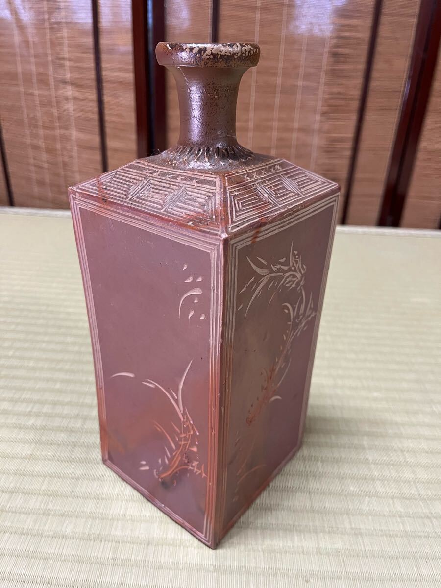 - 古備前 角徳利 四角 保命酒徳利 彫刻 徳利 酒器 一輪挿し 花器 特大 時代物 旧家 蔵出し 傷あり