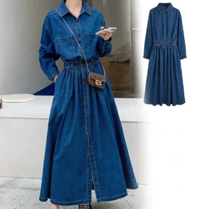 - 新入荷*レディース ワンピース デニムワンピース長袖シャツワンピース前開き無地Aラインスリム ロングワンピ きれいめ 女性着 *