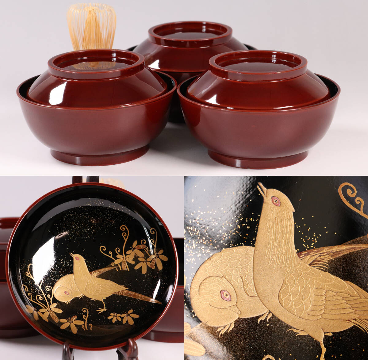 - CM5 時代 加賀蒔絵 鳥図 溜塗内黒 椀 三客 木製漆器 天然木 雉・春草 /(検) 漆芸 茶懐石道具 会席 宴席 吸物 汁椀 能登 輪島 金沢