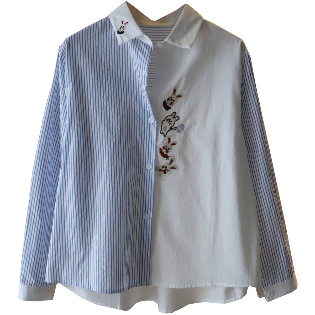 > 新品 刺花柄 縫い合わせ ワイシャツ トップス チュニック 大人可愛 フリーサイズ ナチュラル 綿100% コットン ブルーお色選択可