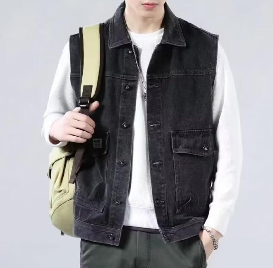 - 人気推薦/デニムベスト メンズ ベスト ノースリーブ オーバーサイズ 重ね着 レイヤード チョッキ トップス ポケット付き 羽織/ブラック