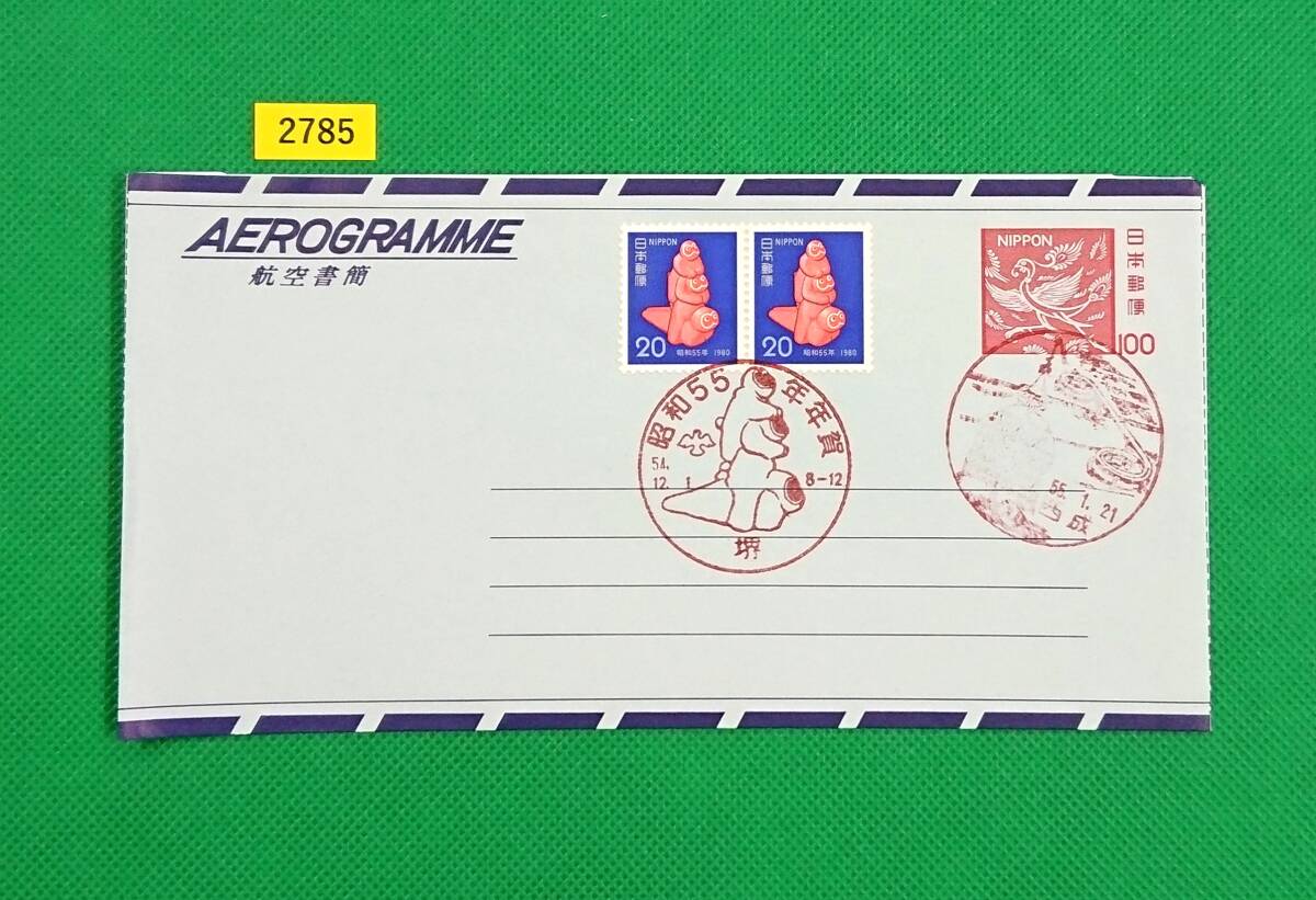 - FDC/年賀切手/昭和55年用/喜々猿/初日印/堺記念印/西成風景印/航空書簡/霊鳥と忍冬唐草模様/1979年12月1日/初日カバー/№2785