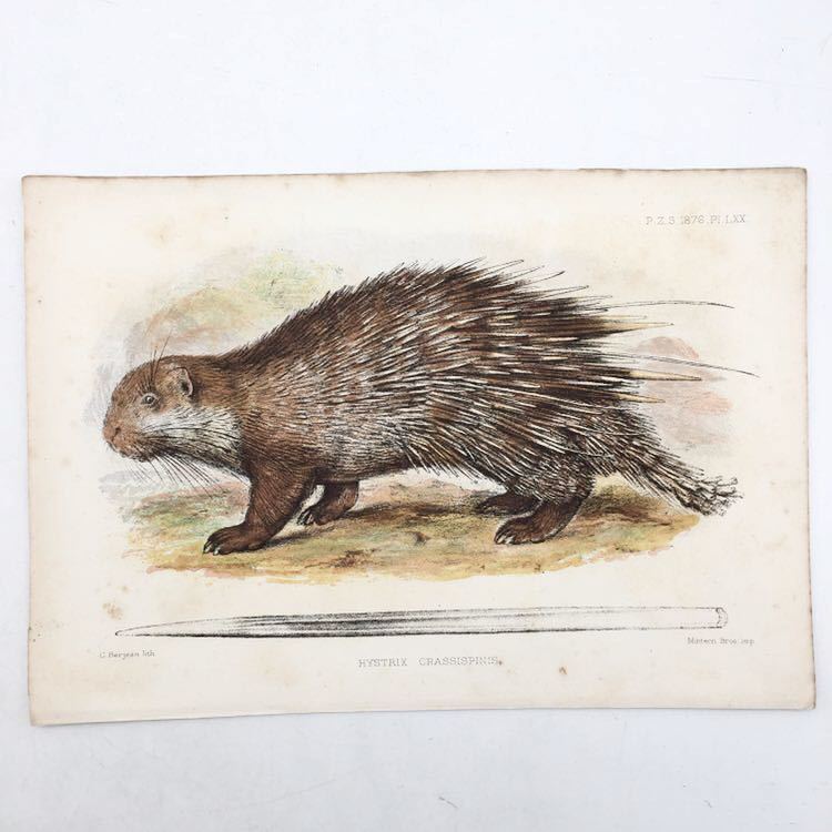 - 博物画『HYSTRIX CRASSISPINIS ボルネオヤマアラシ』 R. Mintern 1876年 イギリス アンティーク 動物 多色刷石版画 リトグラフ