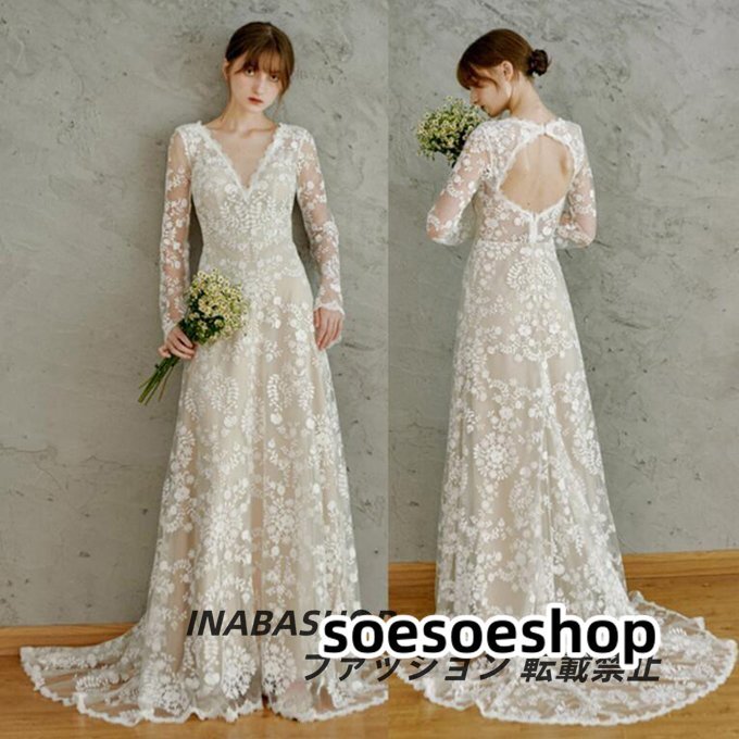 - ウェディングドレス レース 袖あり トレーン付き スレンダーライン ファスナータイプ 背中空き 前撮り 後撮り 披露宴結婚式 海外挙式ドレス