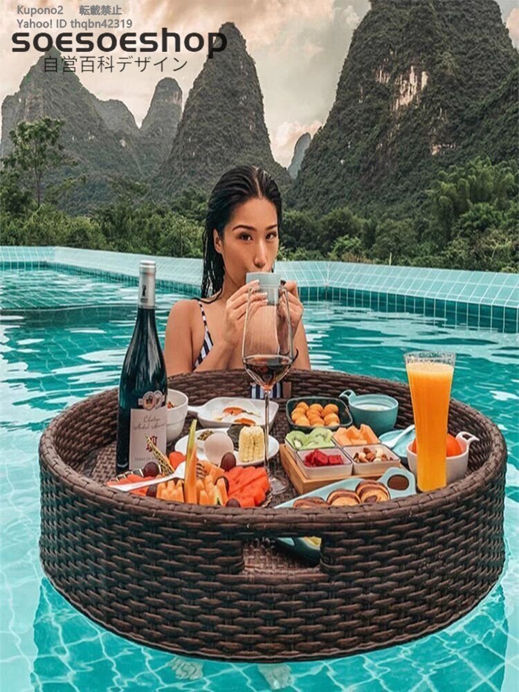 - ラタン編みサービングトレイ、スイミングプールフローティングトレイテーブル、水面フローティングディスク、多機能フローティング朝食トレ
