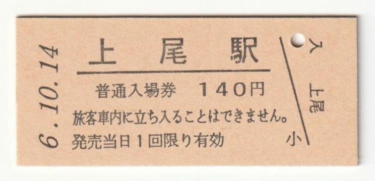 - 平成6年10月14日 高崎線 上尾駅 140円硬券普通入場券(日付印刷)