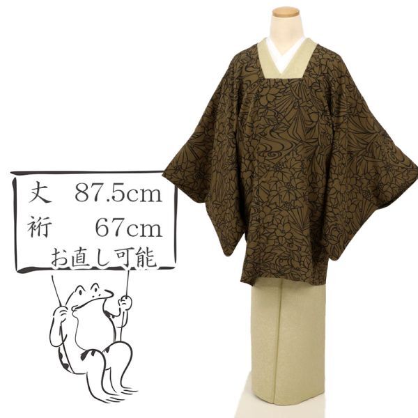 - 【コート】 道行衿 和装コート 葡萄花々植物模様 焦茶色 正絹着物上 CC12-29