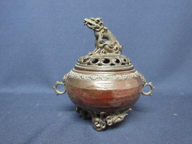> 香炉 透かし獅子蓋 龍足 銘有り 古銅 古美術品 蔵出品 線香立て 高さ約16cm 横約16cm 重さ約1142g 送料無料