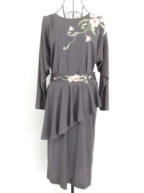 - 【お買得!】★CHALEIL★長袖ワンピース 刺繍花柄/グレー 9 腰フリル付き レトロ柄