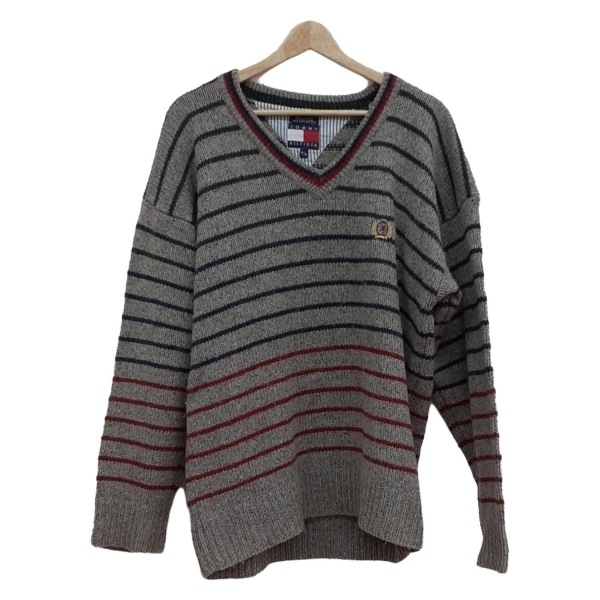 > トミーヒルフィガー TOMMY HILFIGER 長袖セーター/ニット サイズM/M M - グレーベージュ×ダークネイビー×レッド メンズ Vネック/ボーダー