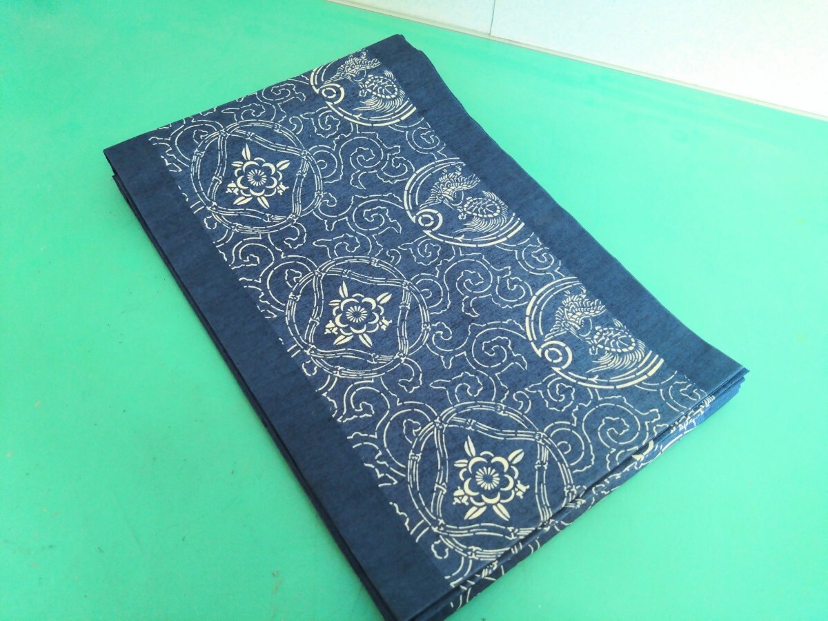 > ●52 希少 藍染 作家 デザイナー Kyoko Bando【坂東京子 作】銘 あり 伝統 工芸 帯 唐草 花紋 鶴亀 紋 縁起物 紬 ? 名古屋帯 中古 ③