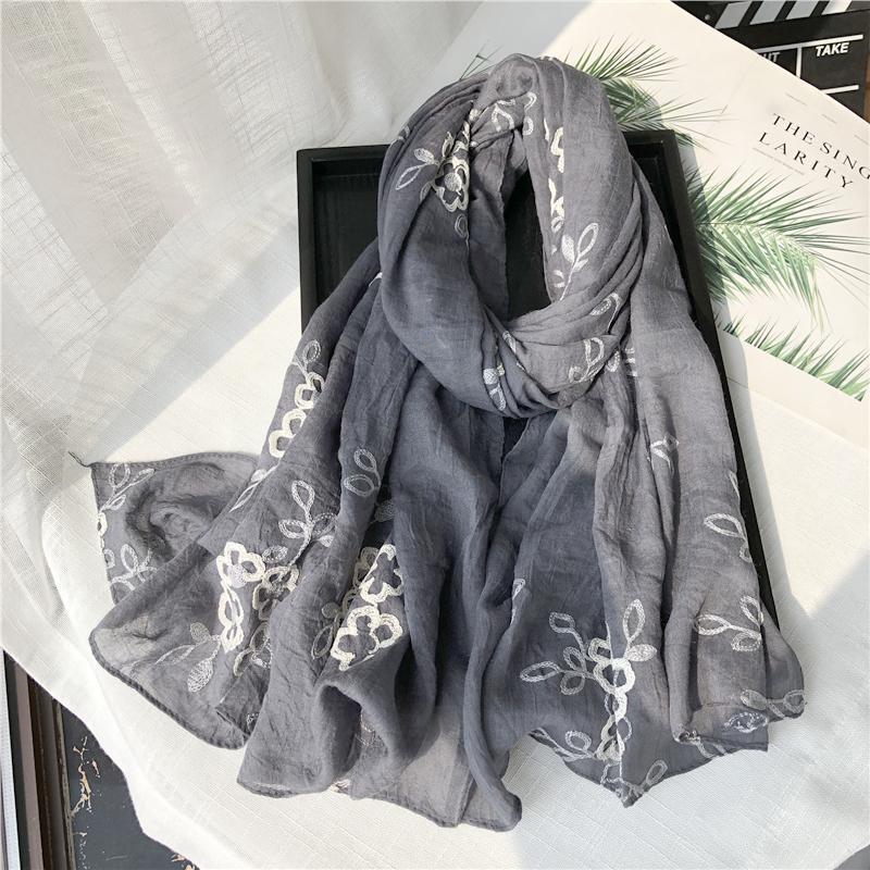 - レディース 春夏 薄地 綿 刺繍 花柄 大判 ストール ショール ダークグレー aa44