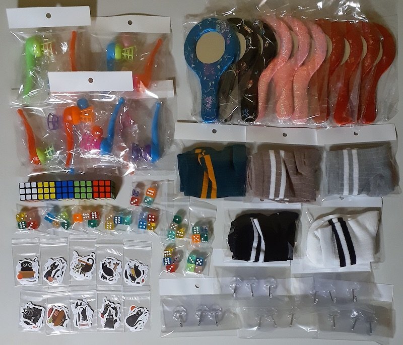 - 5245 景品50個セット 靴下/フック/手鏡/ダイス他 ビンゴジャンケンパーティー 送料含めても1個あたり70円前後100円ショップより安い