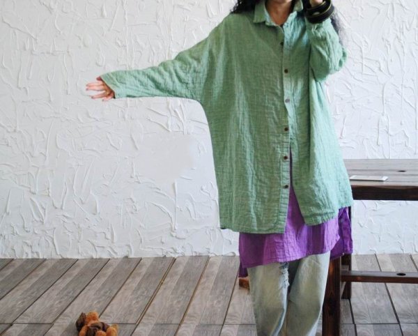 - jm ワイシャツ 綿麻混 カーディガン チュニック トップス アンティーク風 ロマンファッション ゆったり グリーン