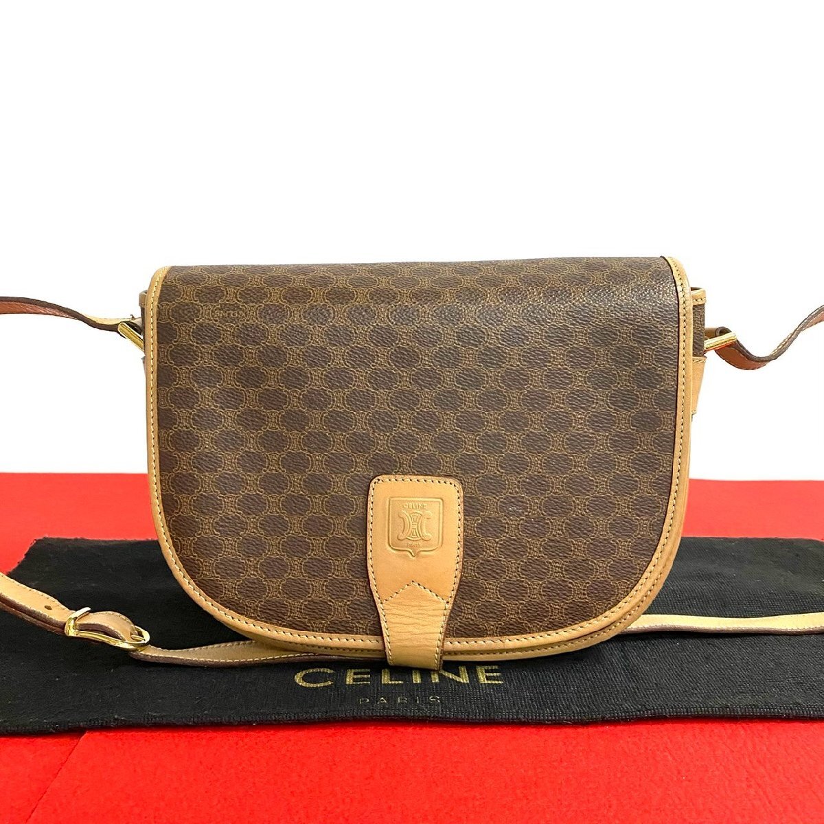 - 極 美品 希少品 CELINE セリーヌ マカダム ヴィンテージ ブラゾントリオンフ 柄 レザー 本革 ショルダーバッグ ポシェット ブラウン 03397
