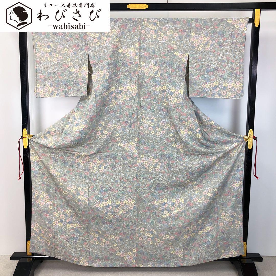 利休鼠色ベースのお色味に優しい色彩の花柄模様がデザインされた素敵な柄裄のお品でございます。