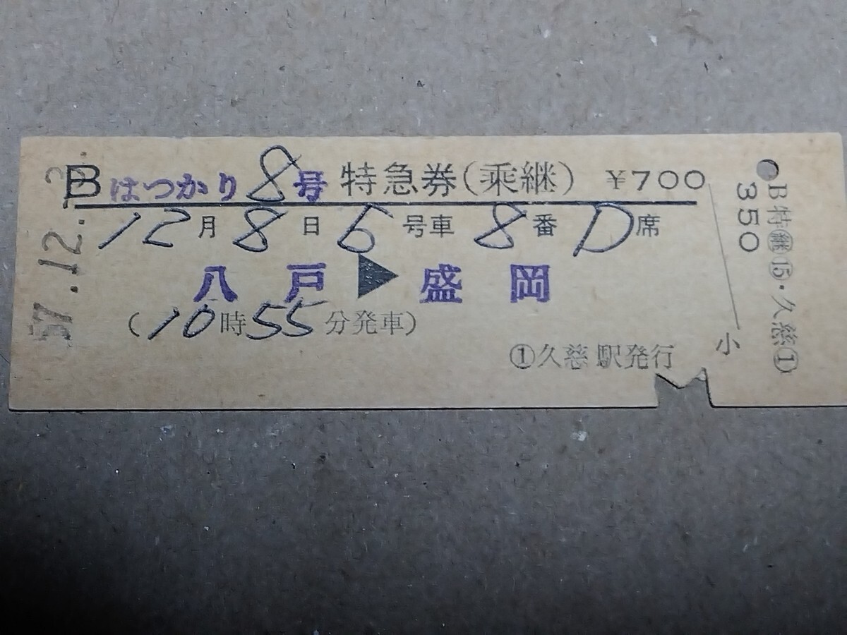 - 250315-240【国鉄きっぷ】D型硬券 八戸→盛岡 はつかり8号特急券 久慈駅発行 昭和57年