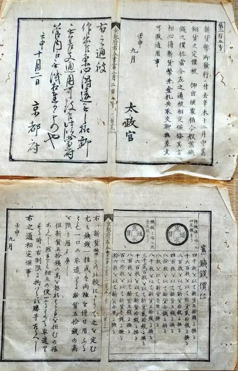 - f25031824〇明治布告布達 新貨幣御発行 旧銅貨の定価 寛永通宝 雛形図面表示 京都府 明治5年〇和本古書古文書