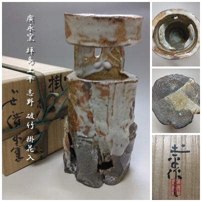 - 【T-331】廣永窯 坪島土平 志野 破竹 掛花入 共箱付 茶道具