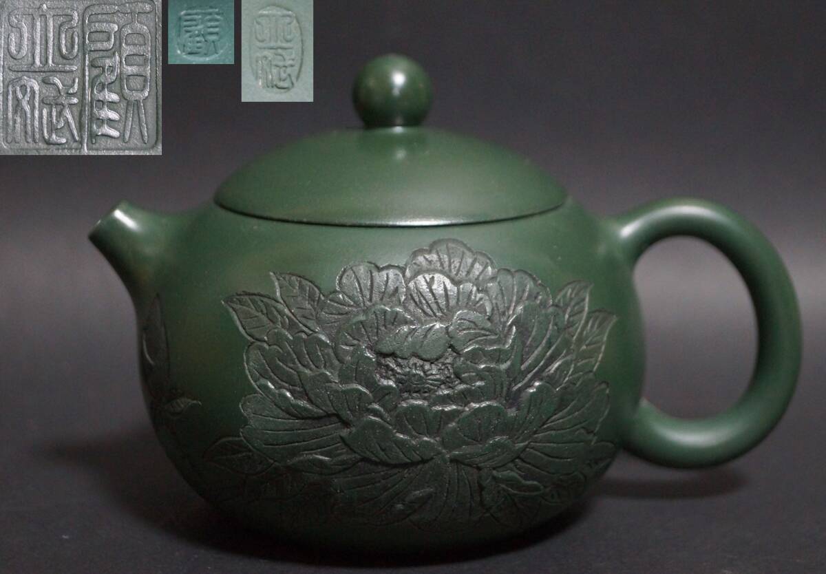 - 【閑】茶道具 中国宜興 工芸美術師 顧立斌作 細工彫り『牡丹漢詩図』 手造り紫砂壺 急須★美品★7D0318ba