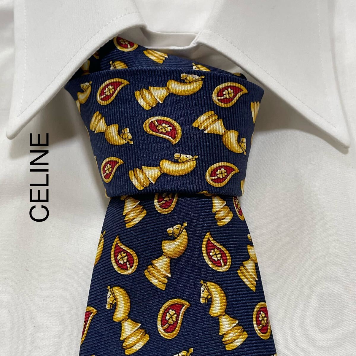 - CELINE セリーヌ チェス柄 デザイン シルク ネクタイ スペイン製 ネイビー TG1192