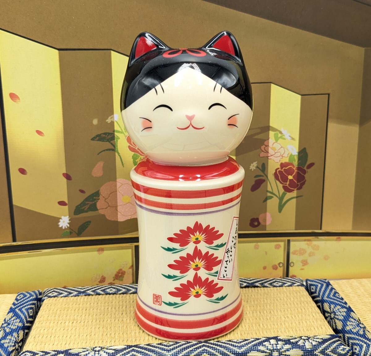 - 縁起物 招き猫 陶器 伝統 彩絵しあわせ猫 こけし 重ね菊 薬師窯