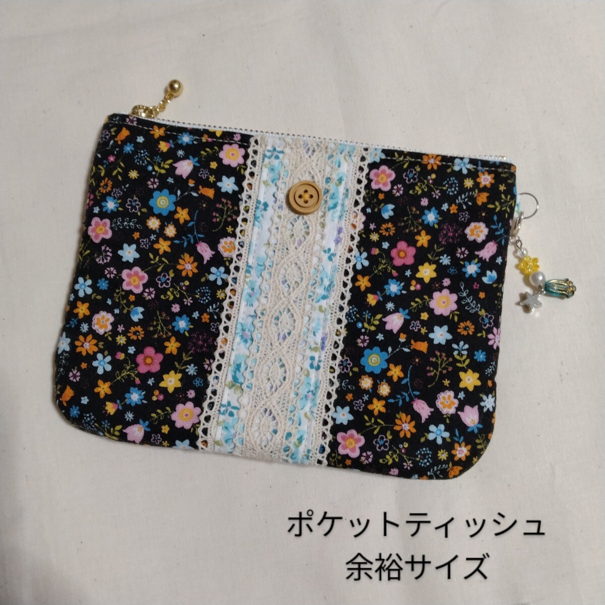 > ★ハンドメイド★花柄レース♪ファスナーポーチ♪ポケットティッシュ余裕♪化粧ポーチ
