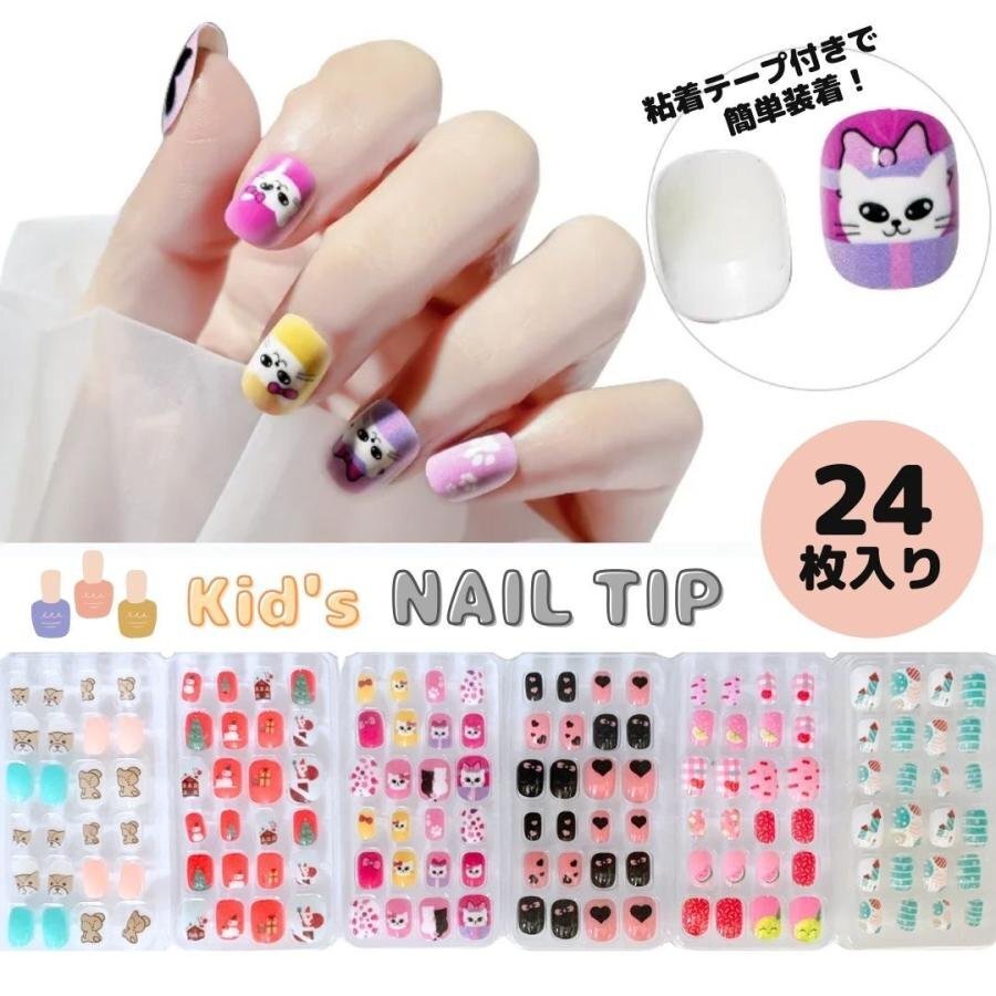 - 【24個】【6種類から選択】【※購入後メッセージ下さい】ネイルチップ 子供用 貼るだけ キッズ テープ 猫 クマ フルーツ 黒猫 サンタ