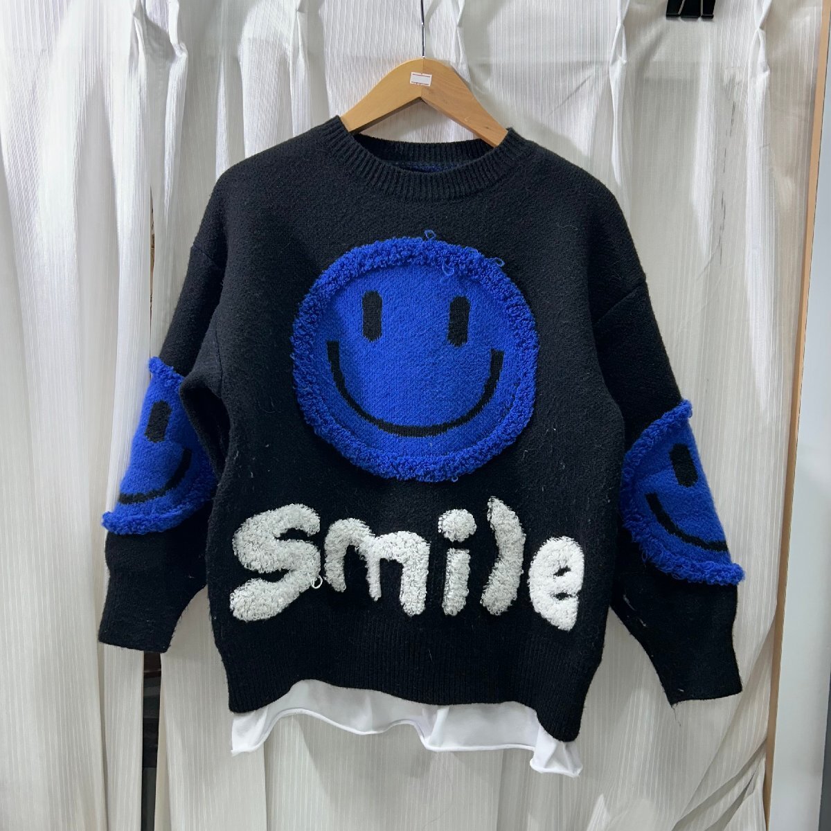 - ♪M♪ Joli Bisous ニコちゃんニット ブラック ブルー ユニセックス 長袖 セーター 少々ほつれ部分あり ファッション 中古品 ♪A-250334