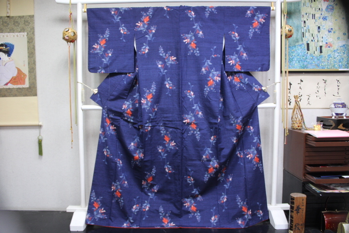 > きもの今昔8338 紬のきもの 広衿袷手縫い仕立きもの 真綿紬紺色地 胴裏真っ白 目立つ問題なし 身丈170cm