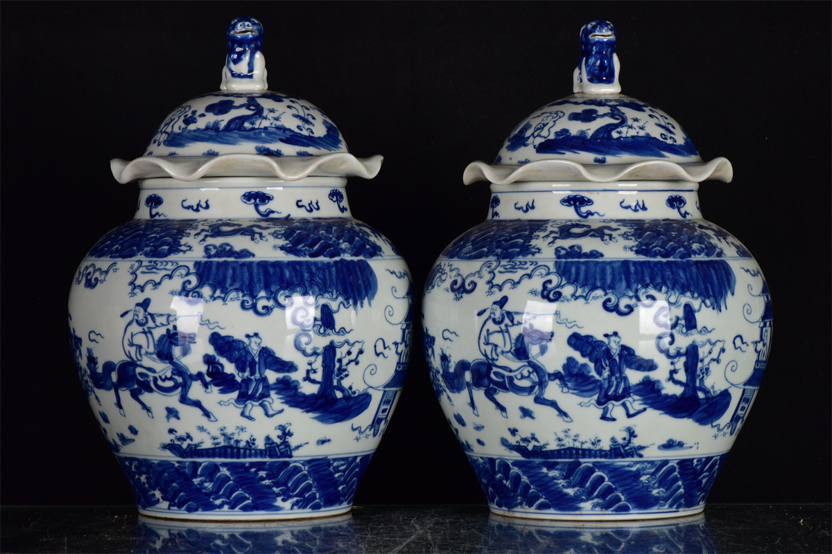 > ◆旧家蔵出◆古美術 中国古玩 大明成化年製款 青花 童子戯図人物故事盖罐―對 古賞物 骨董 時代物 A35