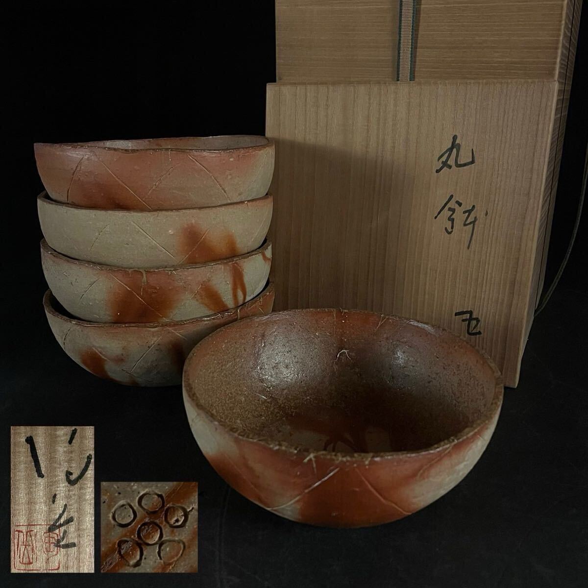 - 森陶岳 秀逸作 備前 丸鉢 5客 懐石 共箱(5b032214 5)