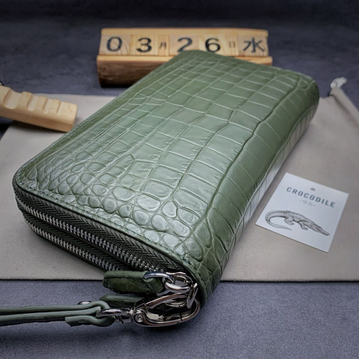 > マット仕上げ【センター一枚革】ダブルファスナー クロコダイル ワニ革 長財布 ラウンドファスナー 希少色 肚革使用 小銭入れあり 実物