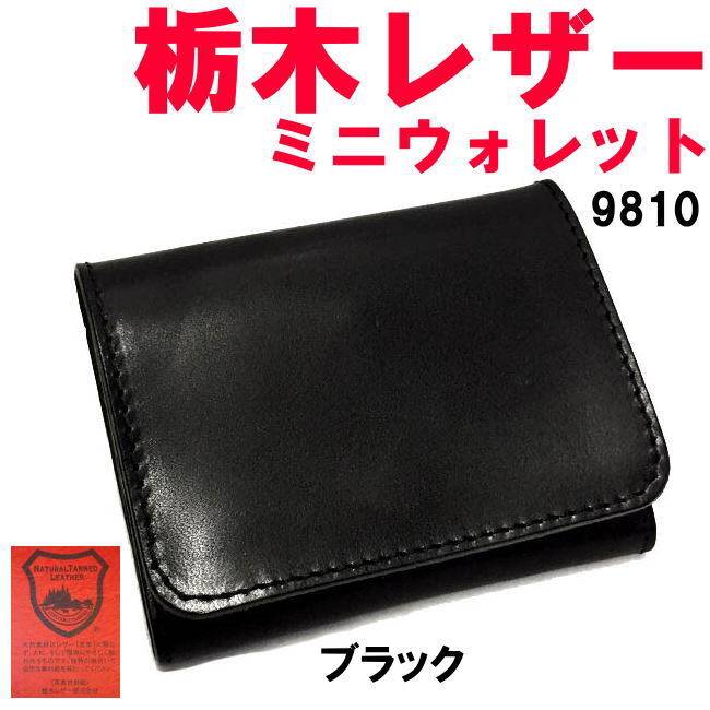 - ブラック 栃木レザー 9810 日本製 お札を折らない ミニウォレット 折財布