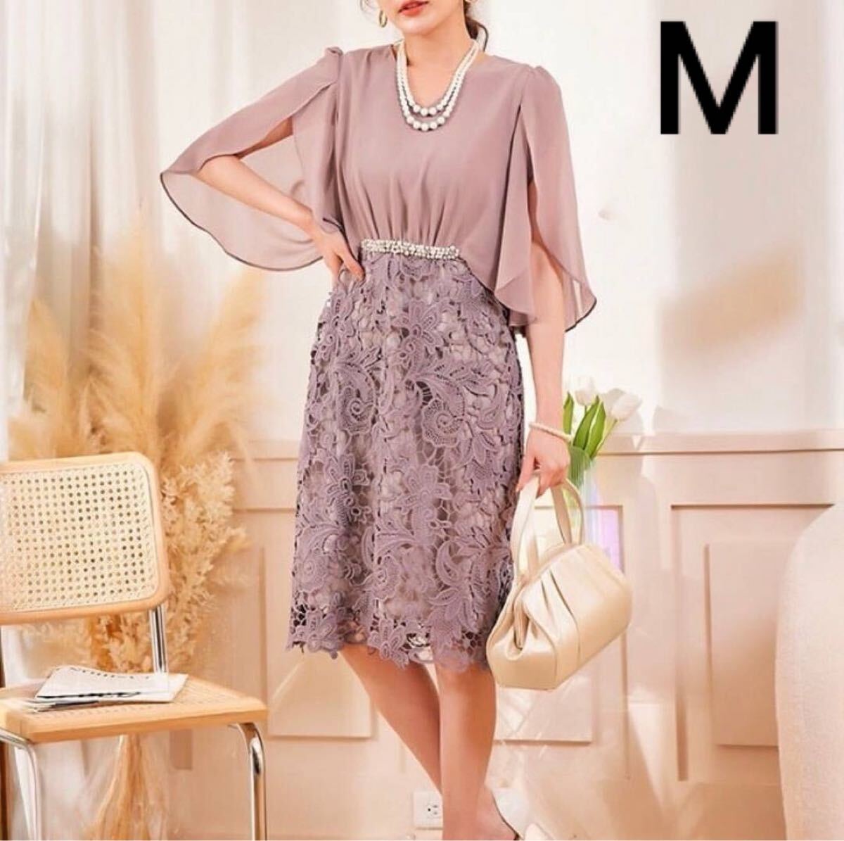 - フリル袖 ウエストデザイン ローズグレー M レーススカート ドレス お呼ばれ