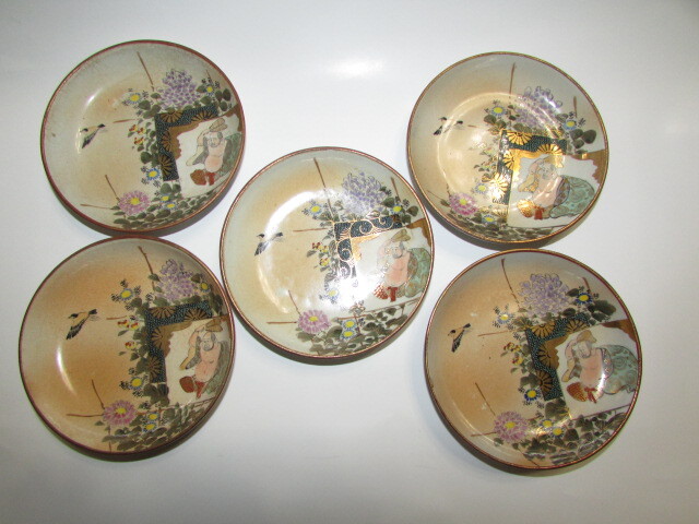 - (会津若松・旧家・蔵出し)明治時代・色絵九谷焼( 縁起の良い・布袋様に菊・雀手描き模様小皿5枚 )貴重・珍品
