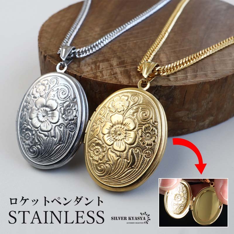 - (シルバー、60cm) ステンレス ロケットペンダントネックレス フラワーネックレス ダブル喜平 メンズ 金アレ対応