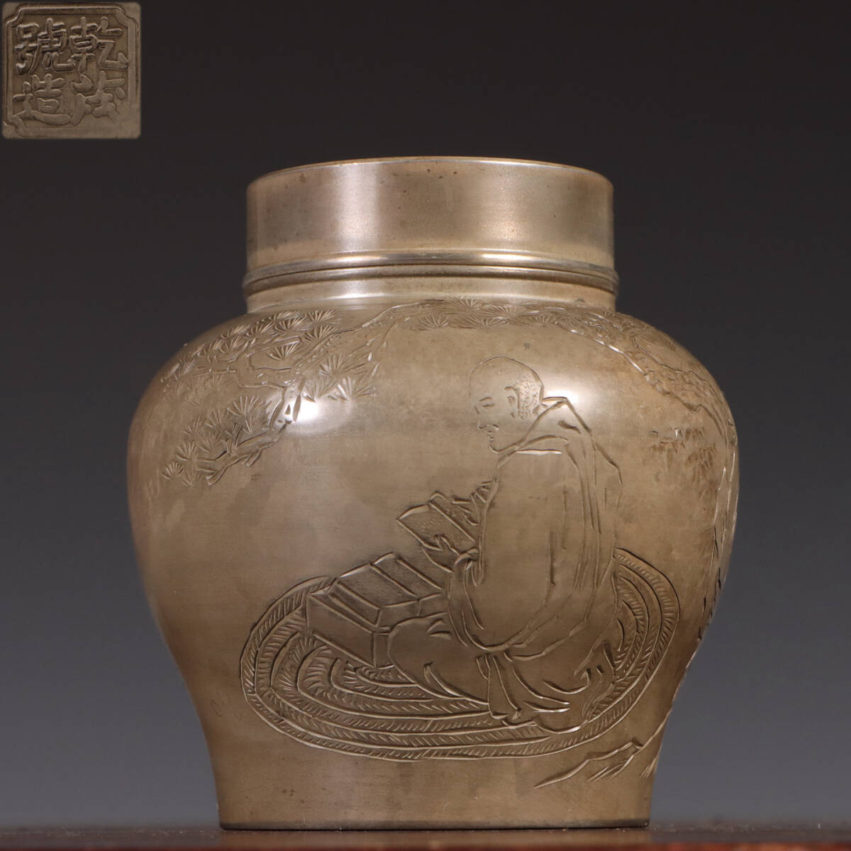 - 古錫 茶葉罐 乾茂號造 「錫刻羅漢詩文茶心壺」 茶筒 茶入 茶壷 茶道具 錫肌 金工 茶器 時代物 重343g LT-2503273