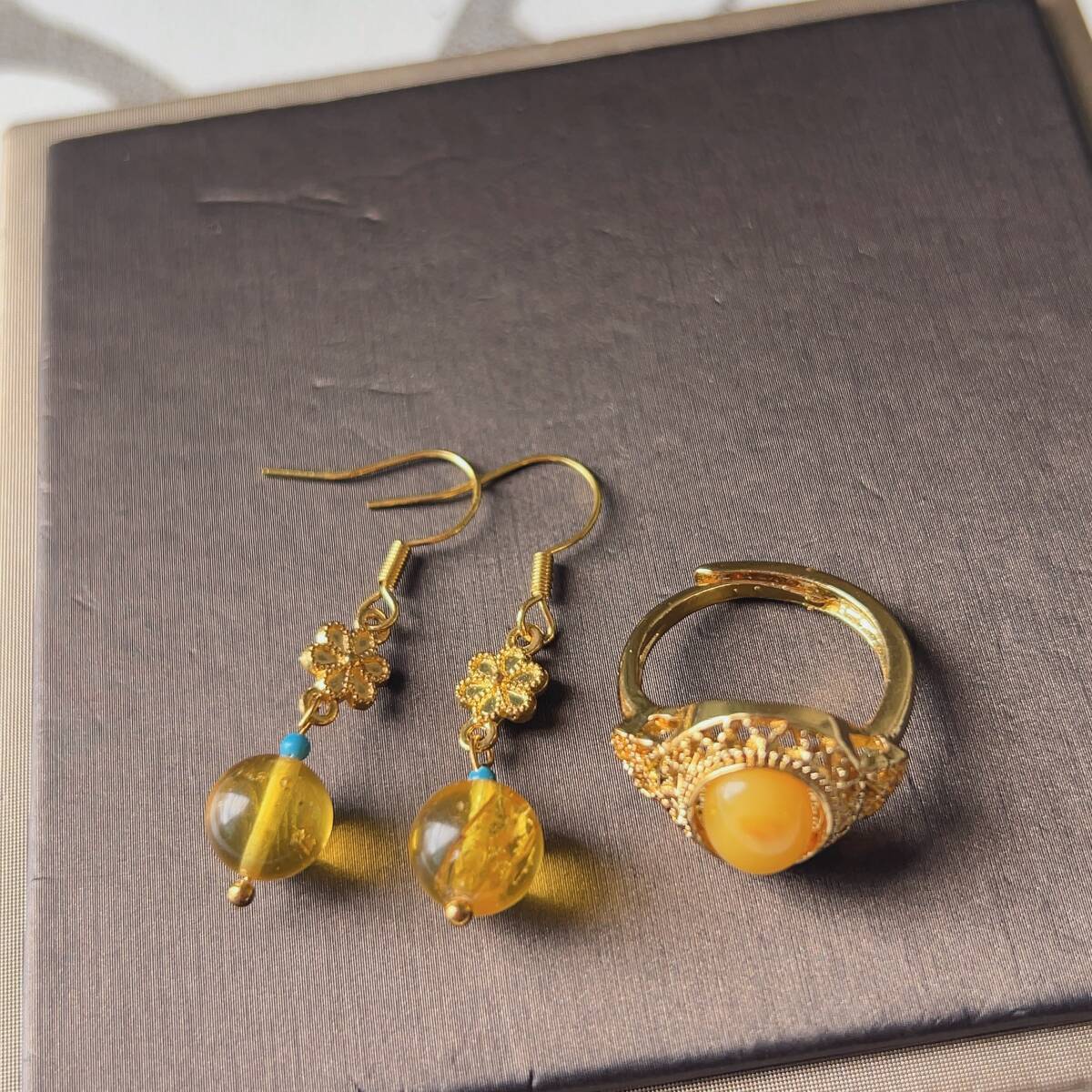 - 訳あり◇蜜蝋琥珀(ハニーアンバー)◇リング(指輪)+ピアス計2点セット◇天然石◇パワーストーン◇巾着袋付き◇プレゼントにも035S2283