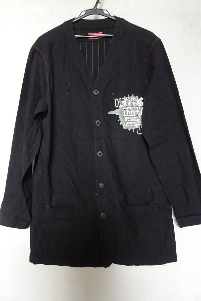 - ”B”design/ビーデザイン/長袖ジャケット/アウター/帆布系素材/Vネック/前ボタン/ミドル丈/ロゴプリント/黒/ブラック/Lサイズ(4/1R7)