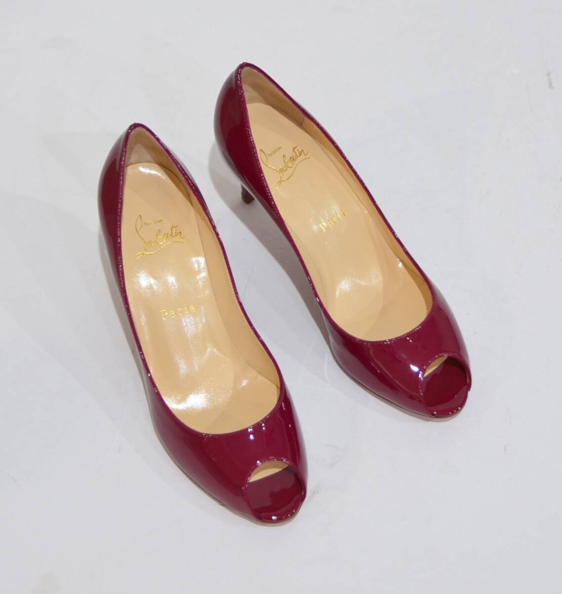 > 新品 Christian Louboutin クリスチャンルブタン オープントゥ エナメル パンプス ワインレッド 37 1/2 Y-332685