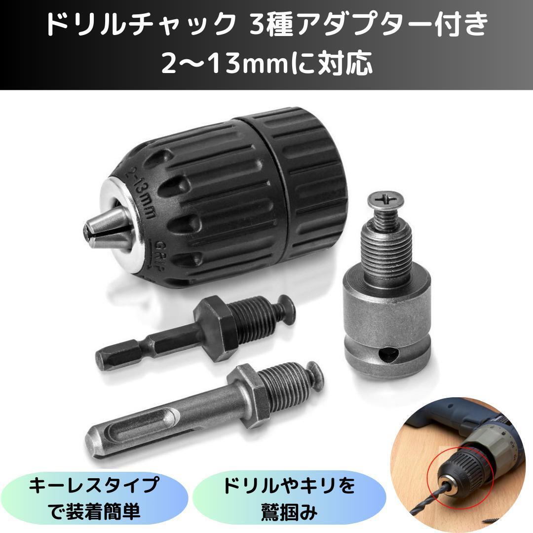 > ドリルチャック 2~13mm キーレスドリルチャック 3種アダプター 電動工具 電動ドライバー インパクトドライバー 電動ハンマー 1/2-20UNF