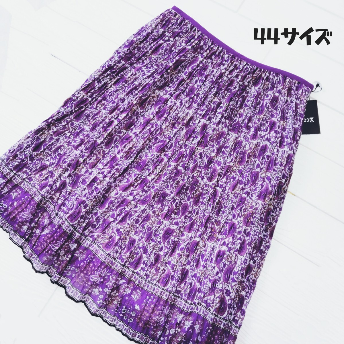 > 未使用品*23区*大きいサイズ44*総柄スカート*オンワード樫山*ペイズリー柄*花柄*赤紫系*フレアー*ランダムプリーツ*金ラメ*春夏向け