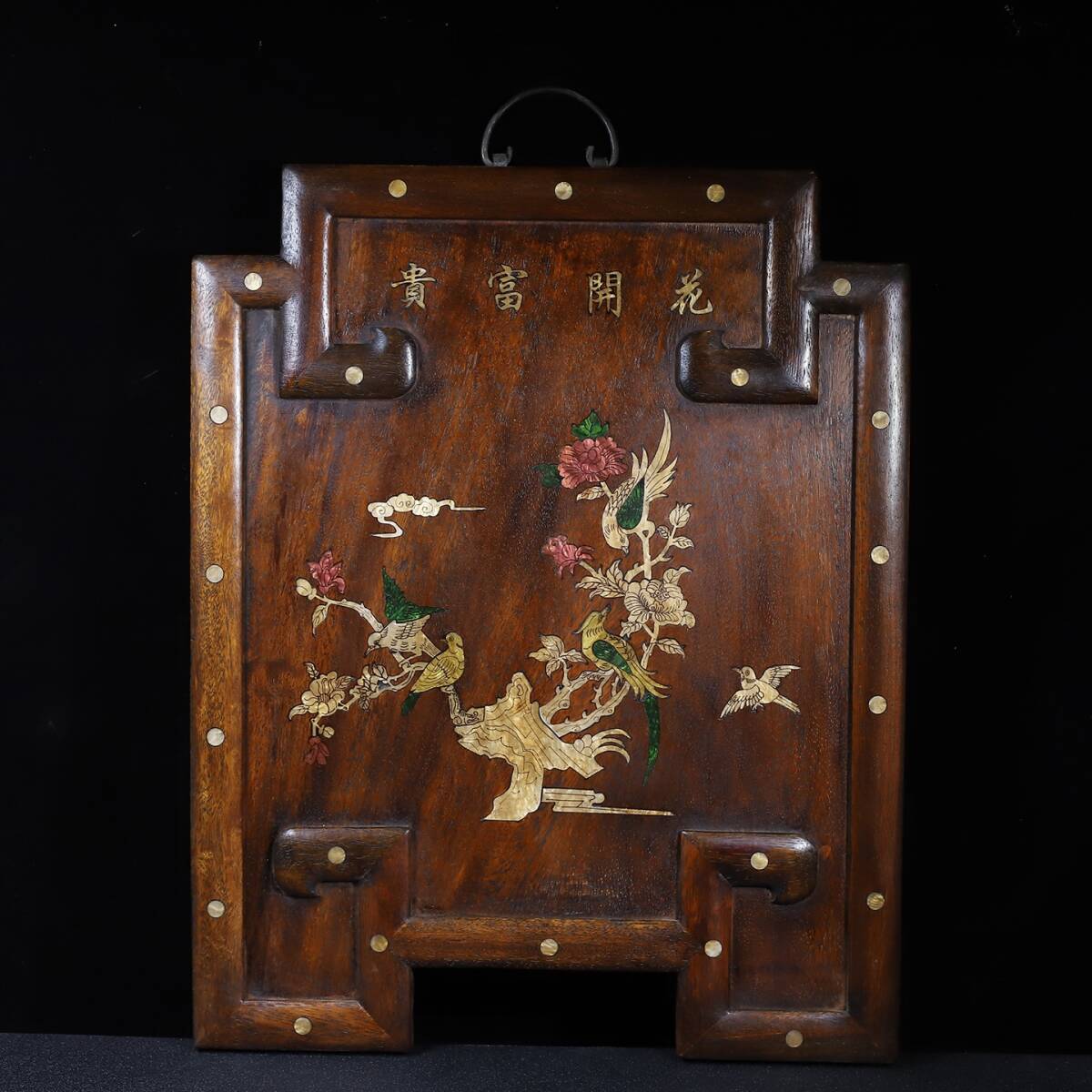 - 旧蔵 清 花梨木 はめ込む貝殼 《花開富貴》掛屏 掛件 極細工 中国古玩 古美術 骨董品 204-03