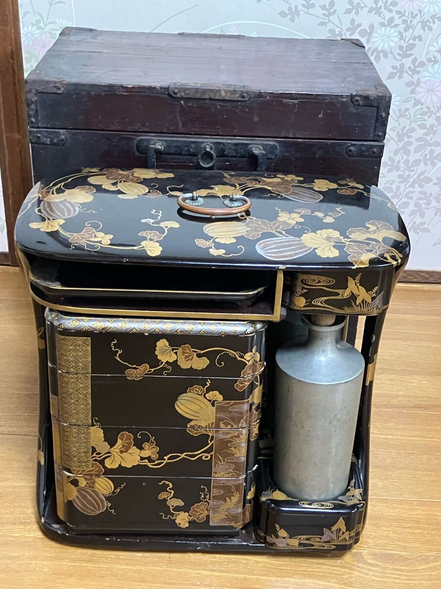 - すずや¥兵衛 野弁当 一式 重箱 徳利 皿 金蒔絵 漆 木製 共箱 茶道具 お花見★06011